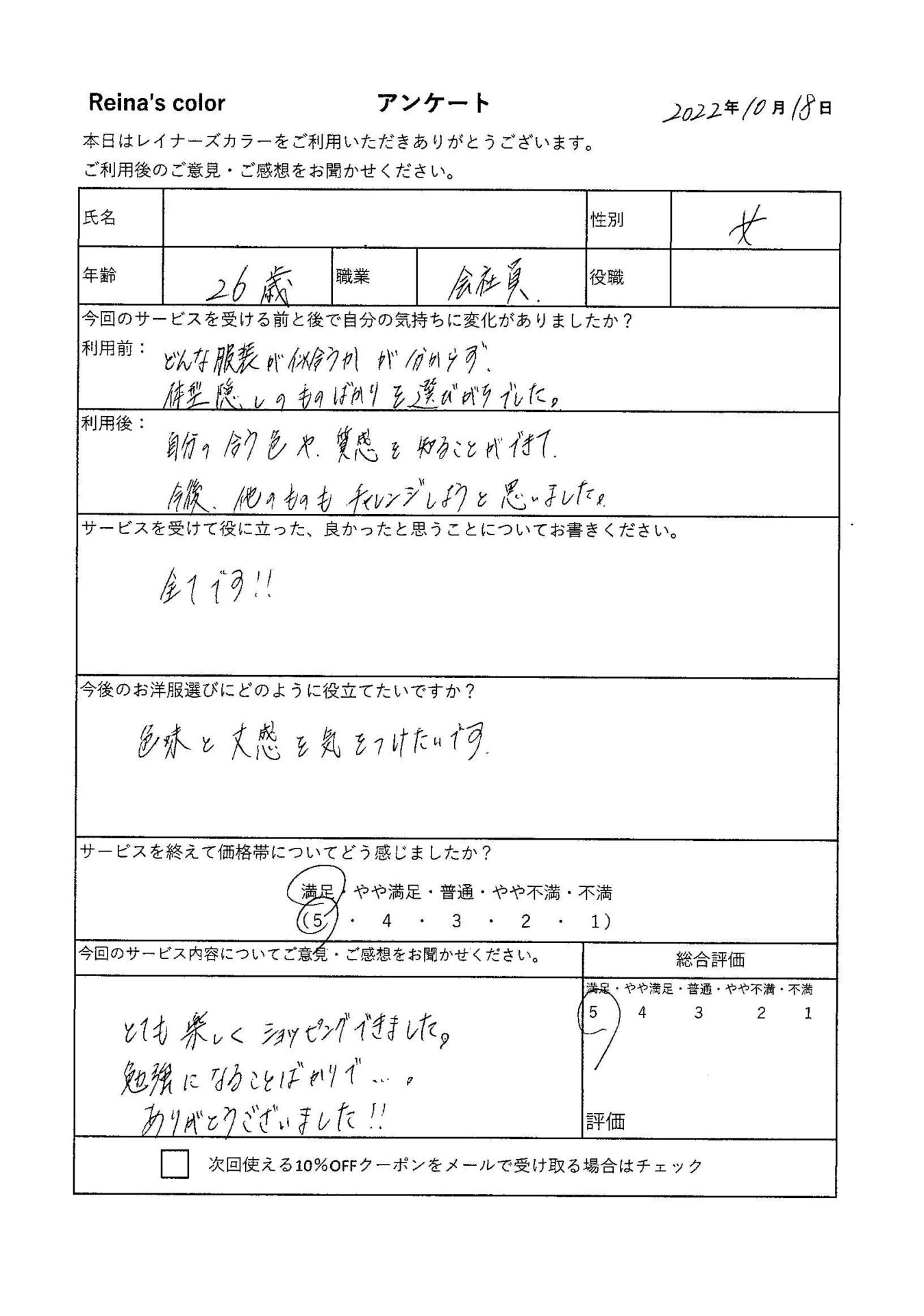 本日、レイナーズカラーのショッピング同行をご利用頂いたお客様の結果となります。